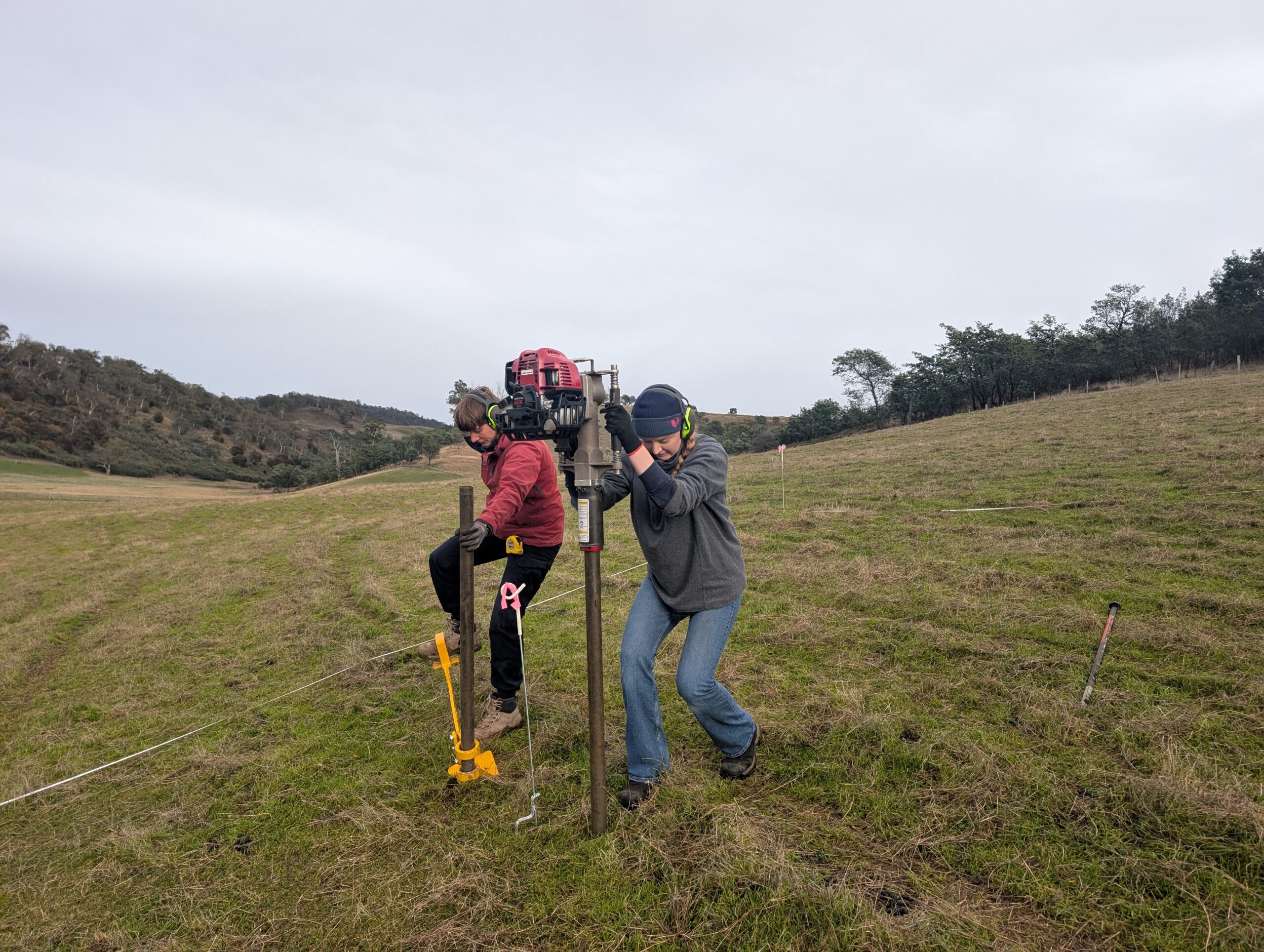 When we reach the site, we chat with the landholder about how they manage their land – grazing rotations, fertiliser use, soil management. Then it’s gloves on, gear out, and straight into setting up our 25m x 25m plot.