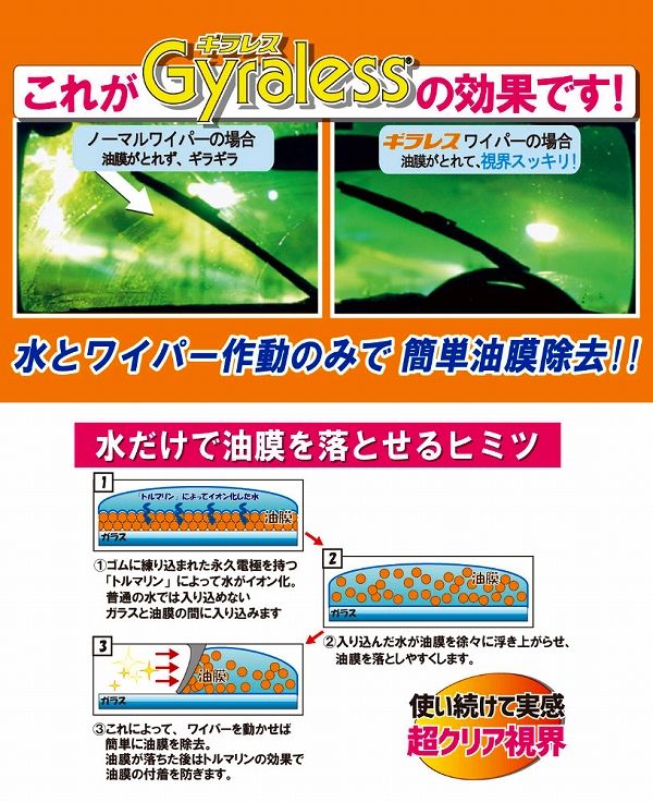 ・ワイパーゴムに練り込まれた「トルマリン(電気石)」の効果で、水を活性化させて油膜を浮き上がらせて除去します。
