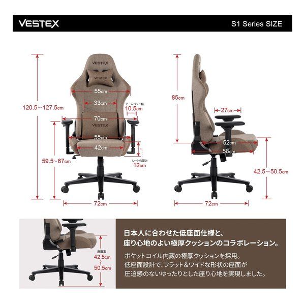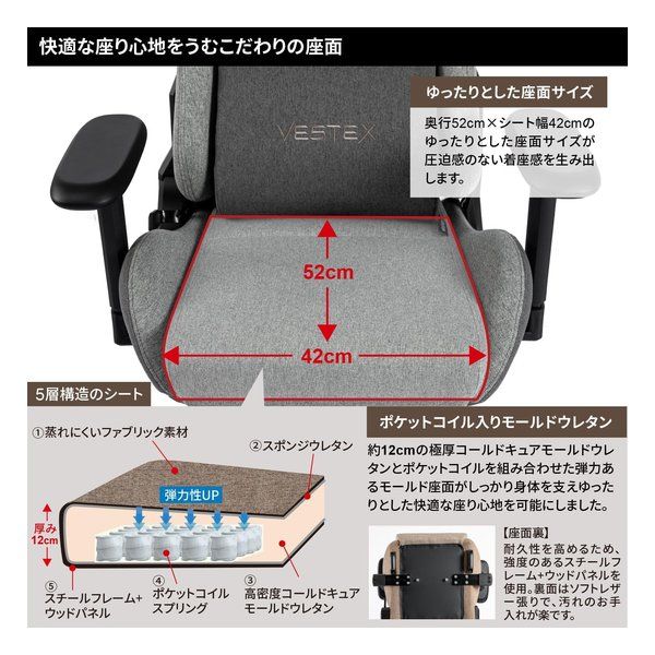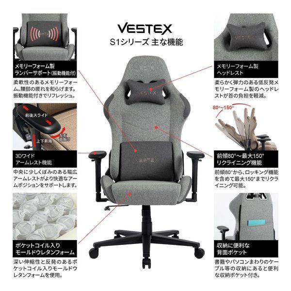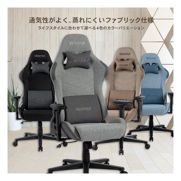 家具開発メーカー「ルームワークス」が、長年のゲーミングチェアの販売経験と家具開発の知見を活かし、日本で企画・設計。「日本人の体形」に寄り添うサイズ設計、生地、パーツを選定を行いゲーミングチェア「VESTEX」が誕生しました。