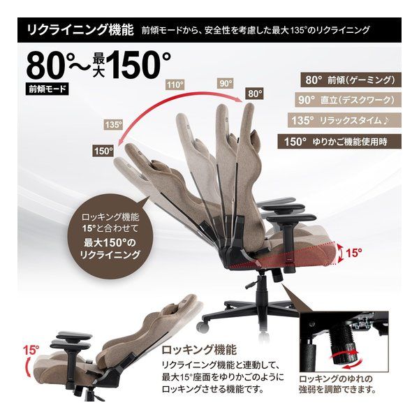 ゲーミングやデスクワークの前傾時に背中をサポートする前傾モード80~最大150のリクライニング機能