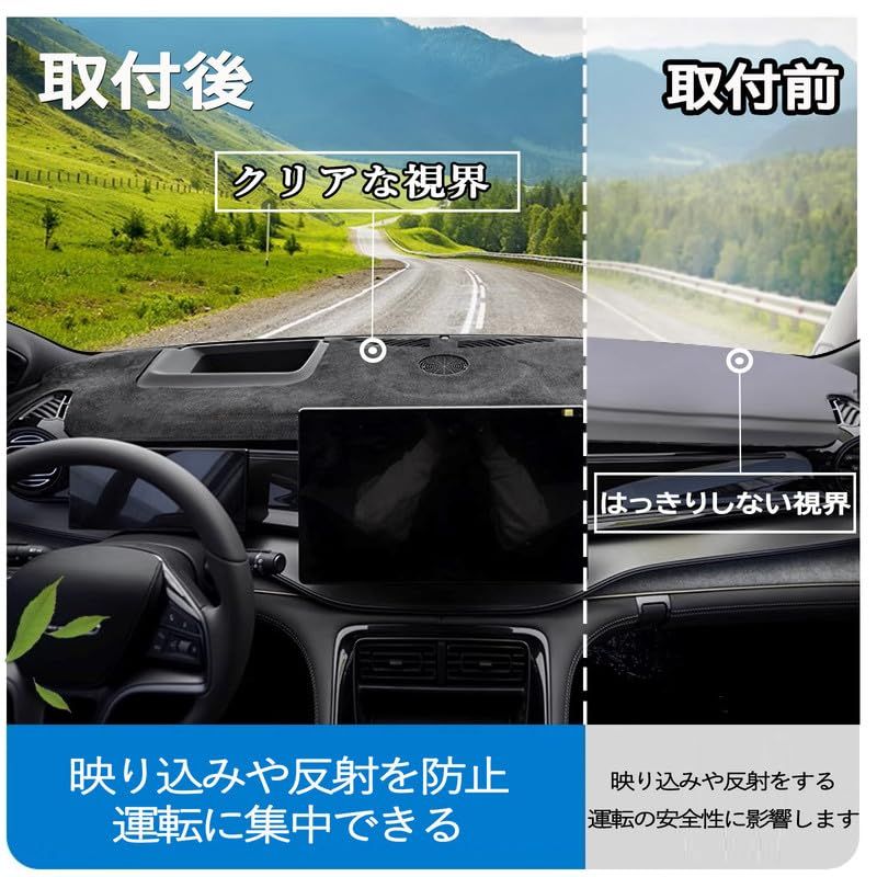 【映り込み防止】ダッシュボードマットがフロントガラスへの映り込みを大幅軽減し、運転による疲労感を和らげます。クリアな視界でストレスの少ないドライブを体感頂けます。ダッシュマットを装着することで紫外線からダッシュボードを守り、ホコリや汚れ、傷が付くことも防ぎます。