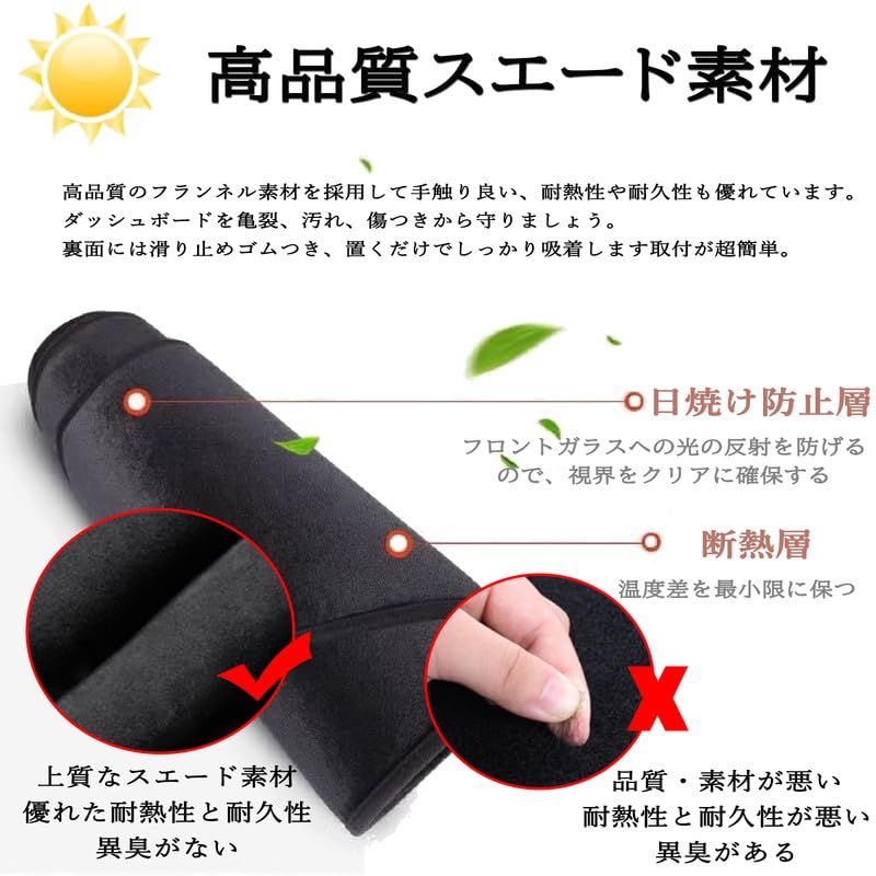 【高品質な素材】上質なスエード素材です、優れた吸熱能力を持っています。材質は丈夫で、変形しにくいです。また、裏面は高密度なシリコン滑り止めデザインなので吸着力があり、ズレたりしません。予備のマジックテープも付きますので、ダッシュボードに置いて位置を調整して初心者でも簡単に取り付けできます。
