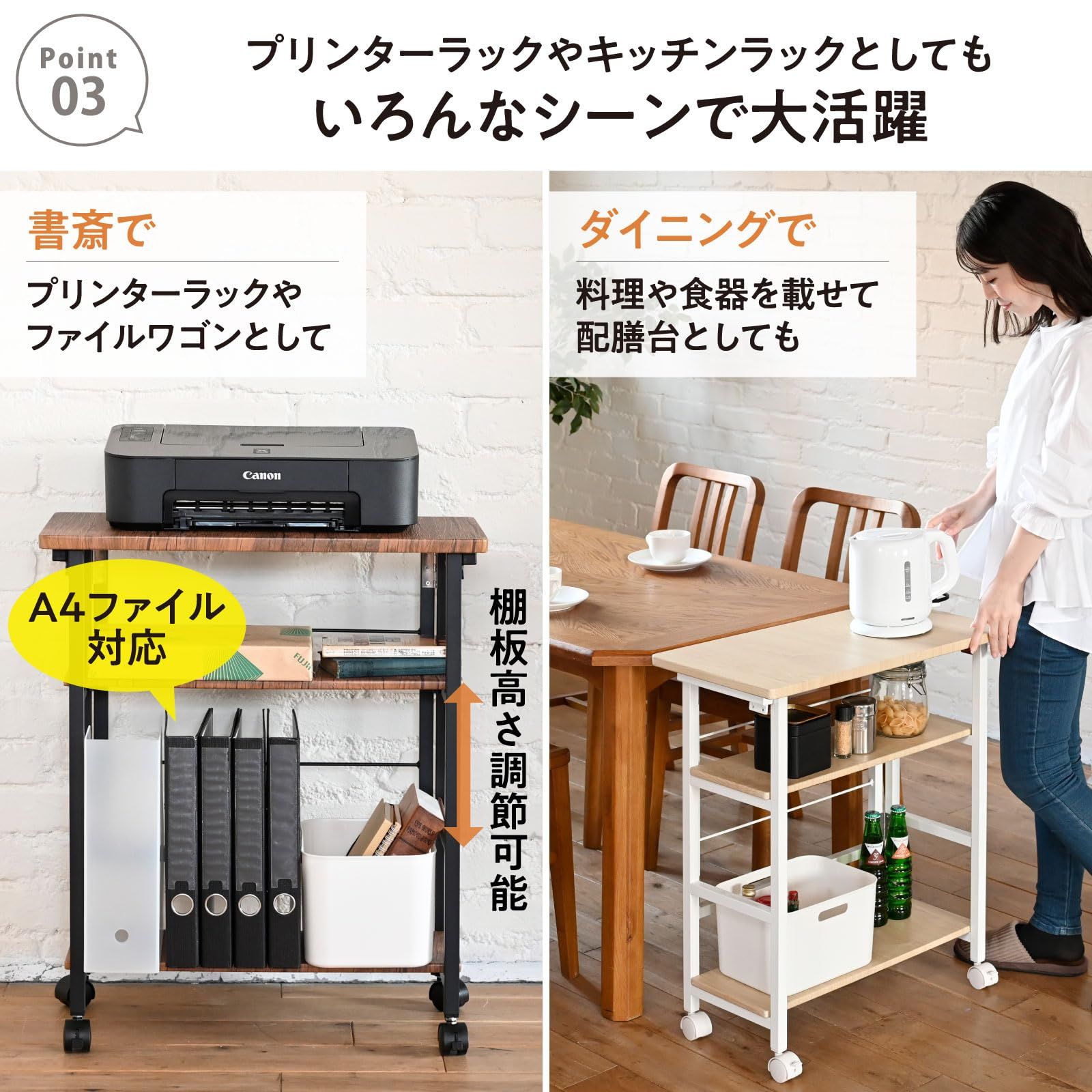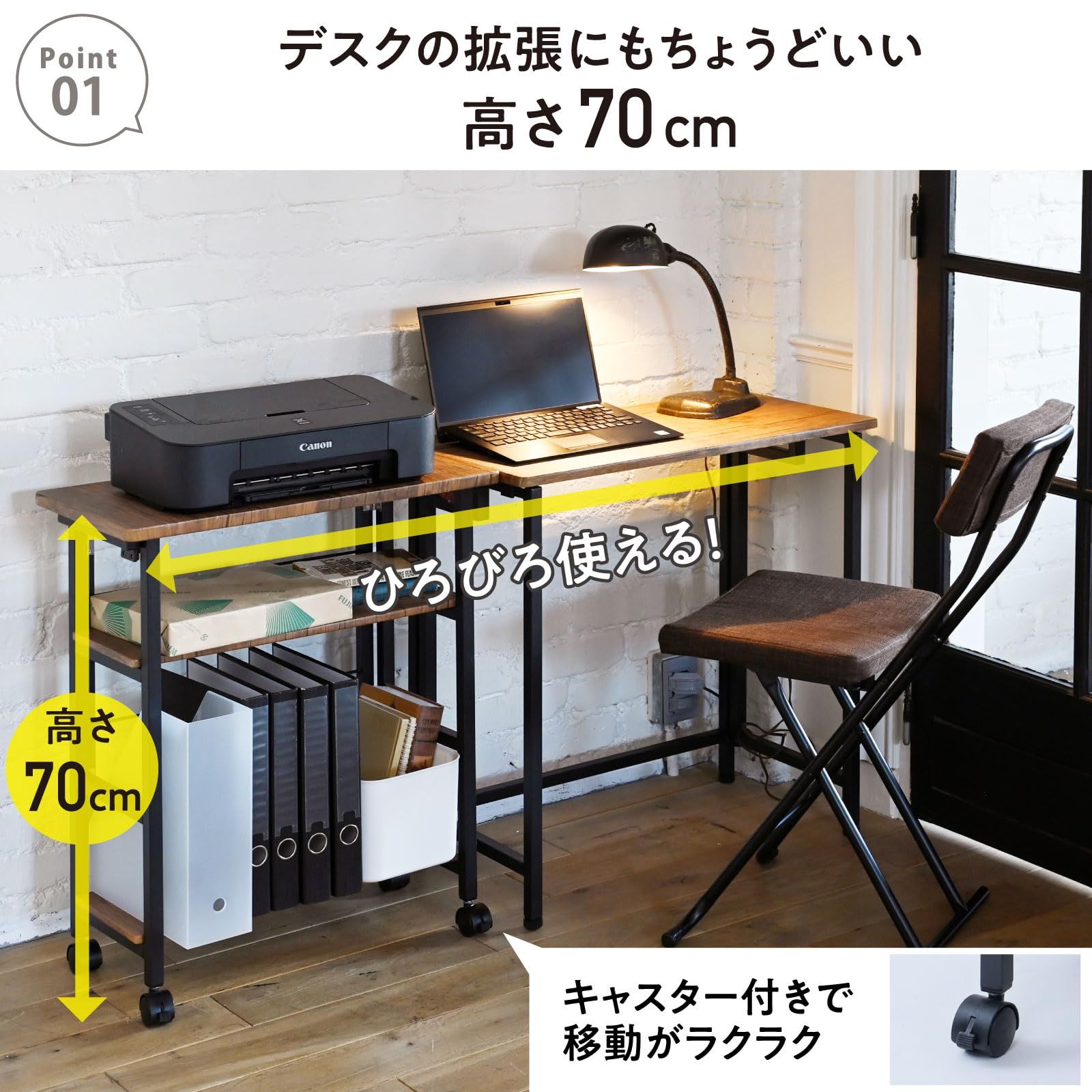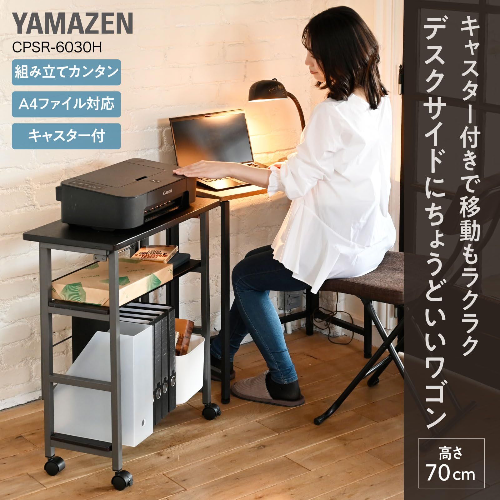 【デスクサイドにちょうどいい】高さ70cmでデスクの拡張にもいい高さのキャスター付きワゴンです。デスク周りで書類や文房具の収納や、プリンター台としてもオススメです。
