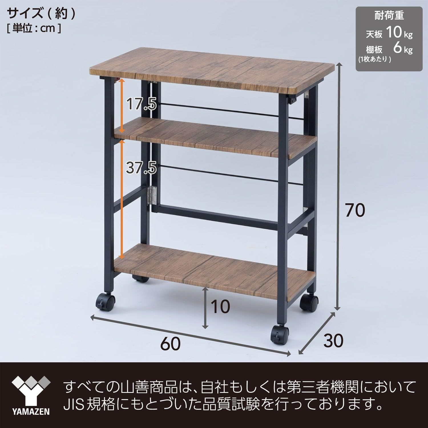 本体サイズ:幅60×奥行30×高さ70cm全体耐荷重:22kg(天板 : 10kg、棚板 : 各6kg)構造部材 : フレーム/金属(スチール)甲板の表面材 : 合成樹脂化粧繊維版(塩化ビニル樹脂)表面加工 : フレーム/エポキシ樹脂塗装東証プライム(株)山善で扱うすべての山善商品は、自社もしくは第三者機関において、JIS規格に基づいた品質試験を行っております。