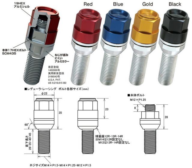 商品名:[KYO-EI_Kics]レデューラレーシングボルト M14×P1.5_14R_首下28mm_19HEX_レッド/20個入【KIC8028R20】