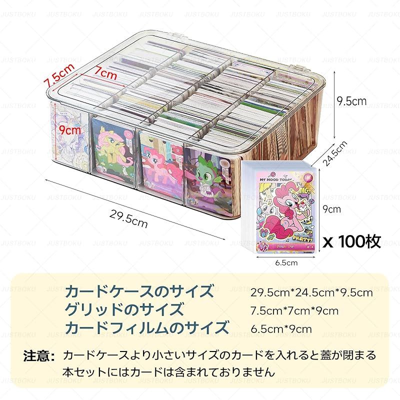 取り外し可能な大容量カード収納ボックス。カードケースのサイズ 縦:29.5cm 横:24.5cm 高さ:9.5cm。グリッドのサイズ 縦:7.5cm 横:7cm 高さ:9cm。注意:カードのサイズはこれより小さくしないと蓋を閉めることができません。本セットにはカードは含まれておりません。カードフィルムのサイズ 縦:6.5cm 横:9cm。