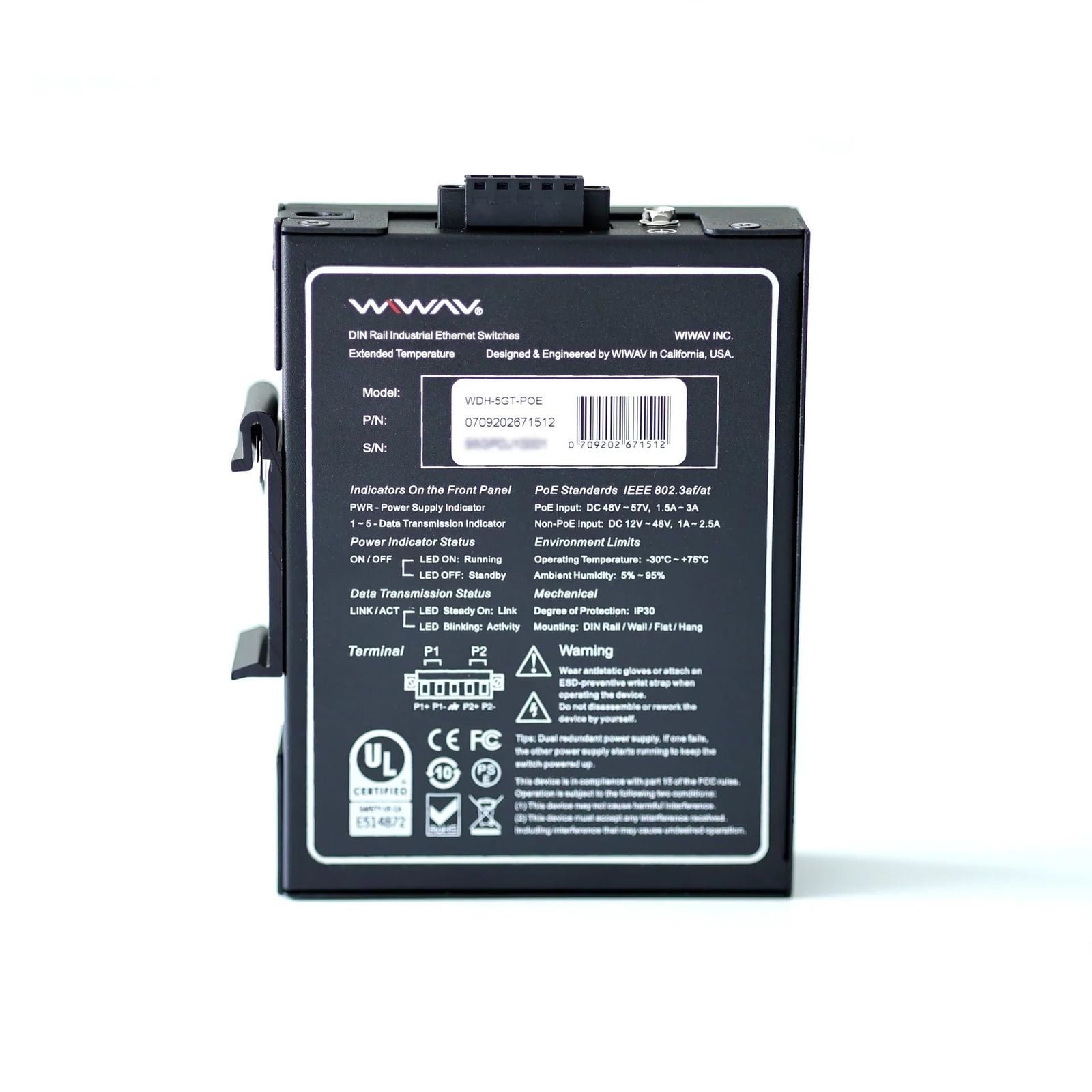 WIWAV WDH-5GT-POE 10/100/1000Mbps 5ポートPOEギガビット産業用イーサネットスイッチ/広範囲動作温度対応(-30~+75C) 超小型 DIN 金属筐体 IP30 UL認証