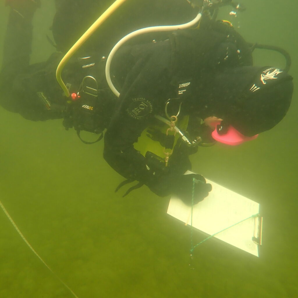 Divers work in pairs for the UVCs and descend along the mooring line to the mooring anchor, or to a GPS point at control sites. Both divers will swim directly outwards from the central point on a predefined bearing and distance up to12m from centre. As they go they record all fish and large macroinvertebrates, including large sessile invertebrates (e.g. ascidians), and taking 5 photoquadrats at each site, they then repeat this process 3 more times along new bearings.