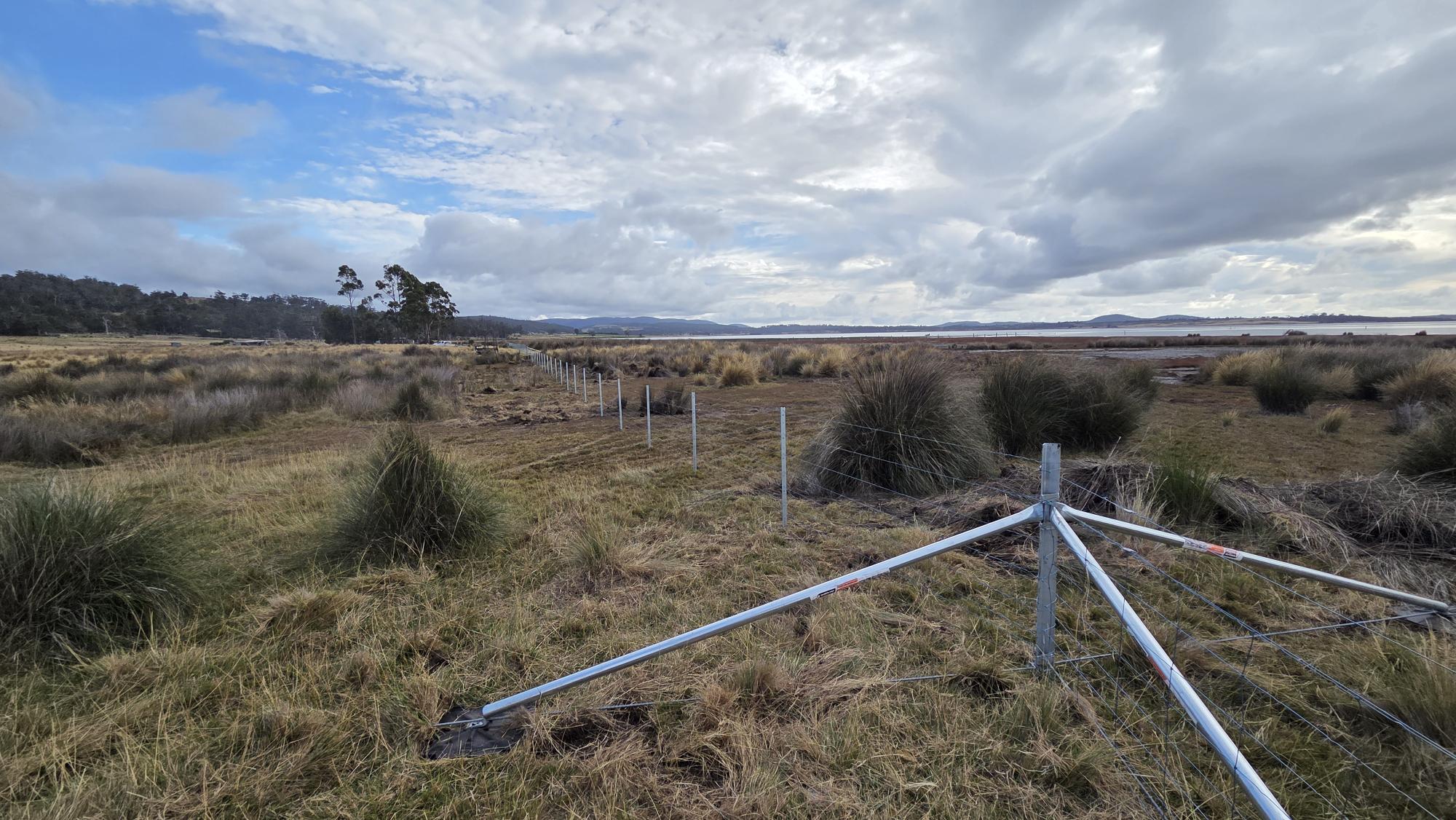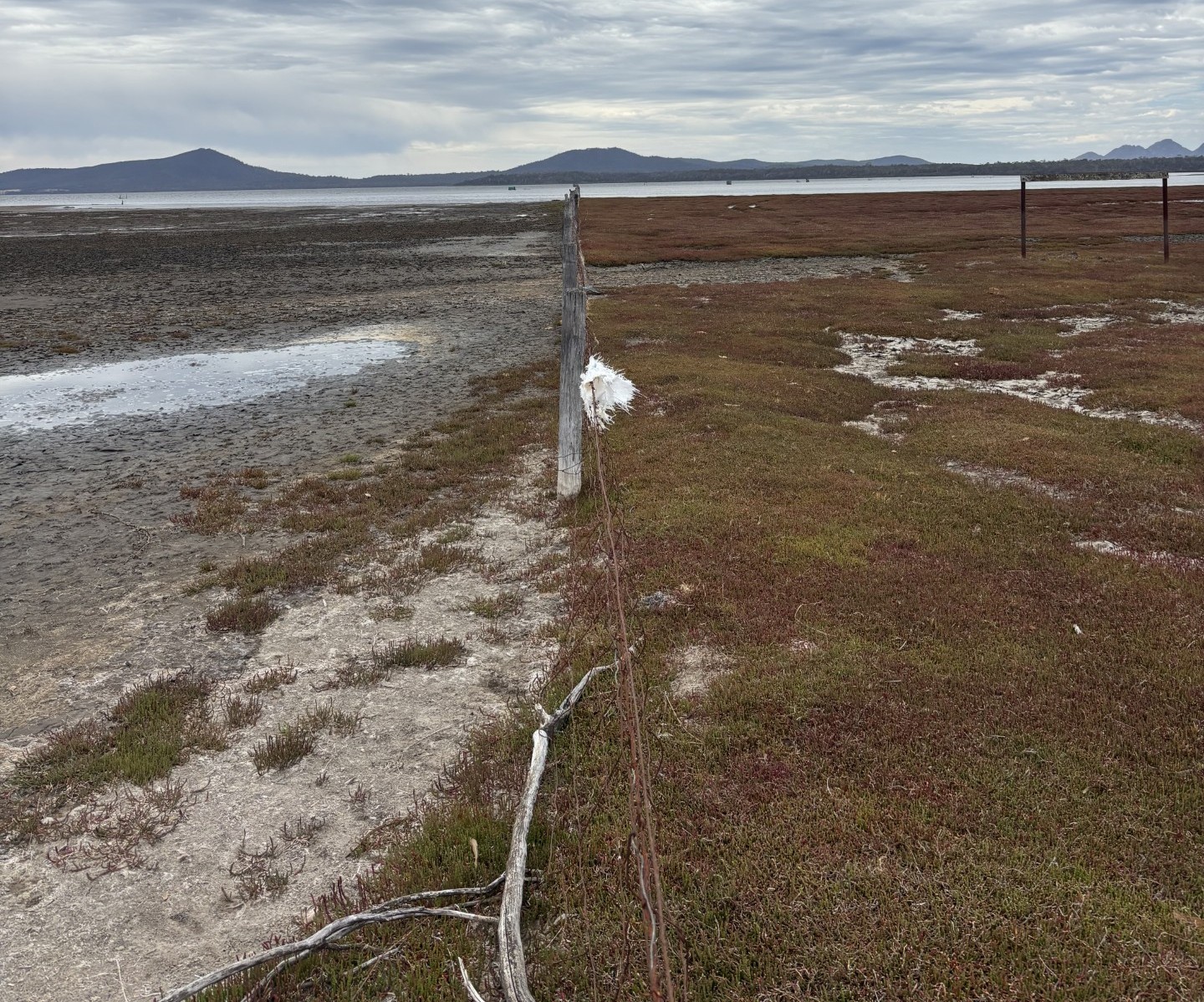 The Cranbrook Estate property boasts 3.8km of coastline adjoining Moulting Lagoon/Apsley Marshes. Over 1km of this has been historically unprotected, resulting in severe degradation of almost 8ha of saltmarsh on the property. See the image below for a stark comparison between an area of protected saltmarsh on the property and the unprotected area.
